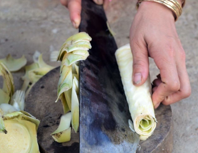 Những nhánh non từ gốc khóm già sẽ được cắt phần thân, gọt vỏ, phần trắng vàng bên trong chính là củ hũ.