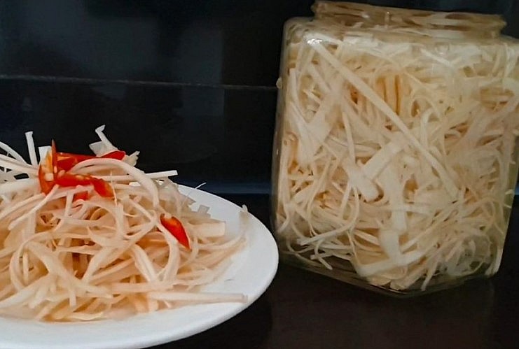Người dân Hậu Giang chế ra hàng chục món ăn ngon từ củ hũ khóm như chiên bánh xèo, làm gỏi, xáo măng, xào, luộc đến làm dưa chua...