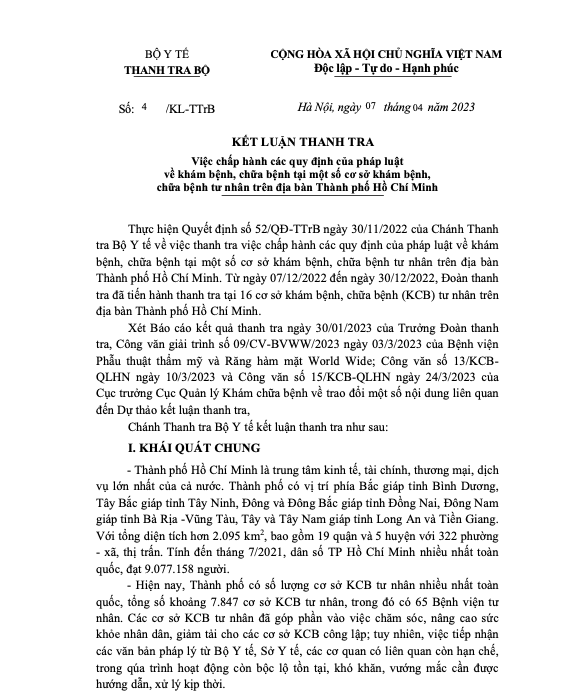 Cụ thể, Thanh tra Bộ Y tế đã chỉ ra nhiều sai sót tại các bệnh viện, cơ sở khám chữa bệnh tư nhân tại TP. Hồ Chí Minh. Đoàn thanh tra đã tiến hành thanh tra việc chấp hành các quy định của pháp luật về hành nghề y tại 16 cơ sở khám chữa bệnh tư nhân.