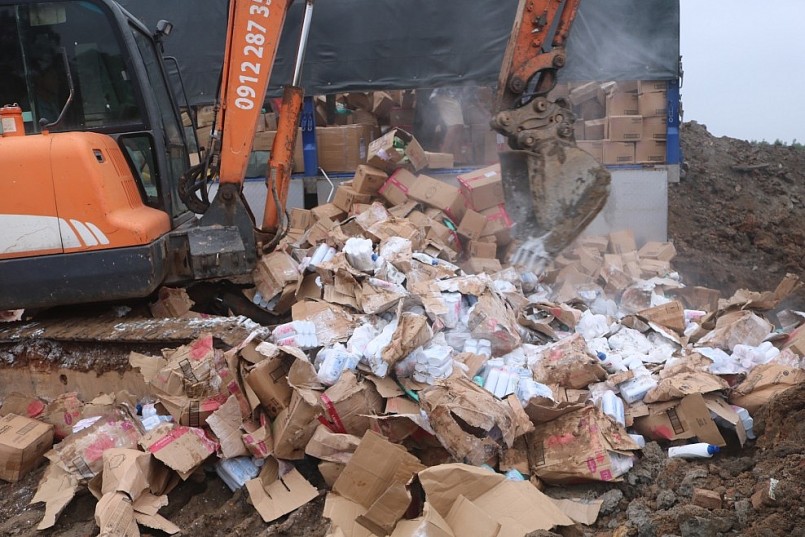 Việc tiêu hủy được thực hiện với sự tham gia giám sát của đại diện các ngành có liên quan gồm: Công an tỉnh, Sở Tài nguyên và Môi trường, Sở Tài chính, Sở Khoa học và Công nghệ, Sở Y tế, Sở Nông nghiệp và PTNT và các Phòng chuyên môn, các Đội QLTT thuộc Cục QLTT tỉnh Quảng Bình.