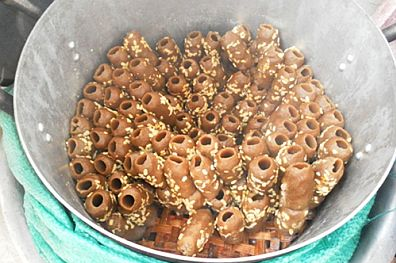 Để làm bánh, người ta xay củ khô thành bột, trộn hai loại với đường mía, thêm nước vào rồi nhào bột. Khi bột đã vừa dẻo vừa mịn, bột sẽ tiến hành nắm vào một trong những chiếc đũa rồi rút ra tạo thành lỗ tại chính giữa. Sau lúc hoàn thành các bước trên thì cho bánh vào nồi hấp. Khi bánh chín sẽ có được màu nâu và thơm nức mùi khoai hòa quyện cùng vị ngọt của đường mía.