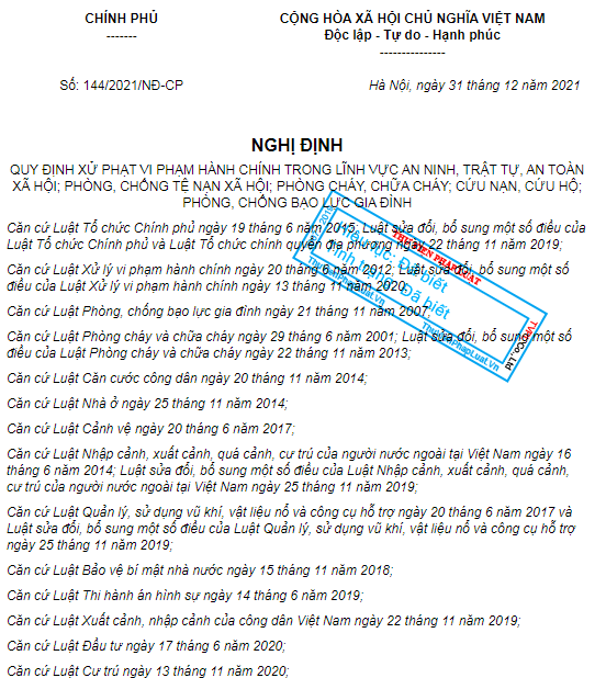 Chính phủ ban hành Nghị định 144/2021/NĐ-CP quy định xử phạt vi phạm hành chính trong lĩnh vực an ninh, trật tự, an toàn xã hội; phòng, chống tệ nạn xã hội; phòng cháy, chữa cháy; cứu nạn, cứu hộ; phòng, chống bạo lực gia đình.