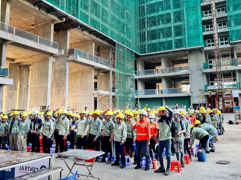 | Công nhân dự án Astral City tham gia buổi họp đầu tuần |