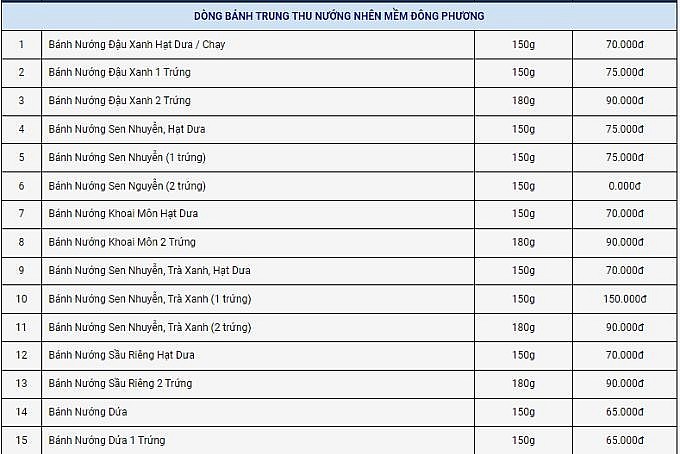 Trong bảng giá bánh trung thu Đông Phương 2023, một chiếc bánh trung thu nhân đậu xanh có giá như sau: