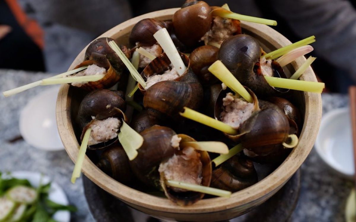 Ốc bươu nhồi thịt là món ăn vặt ưa thích của cả người dân địa phương lẫn du khách. Ốc bươu được làm sạch, khử mùi tanh, được nhồi thịt heo xay nhuyễn tẩm gia vị vừa ăn, thêm vài cọng xả dậy mùi thơm rồi đem hấp. Thịt ốc luộc thơm lừng, dai dài, hòa cùng mùi sả đậm đà và nước chấm chua ngọt đích thị là "mỹ thực". Một quán ốc bươu nhồi thịt có thể làm thơm phức cả một góc phố.