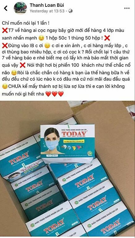 Tương tự, chị Loan ở Đồng Xoài (Bình Phước) kể đã mất 350.000 đồng khi đặt mua hộp khẩu trang 3M 9001V có van lọc mùi hôi. Loan cho biết, một facebook tên Nguyễn Nhật Linh yêu cầu chuyển khoản vào tài khoản mới giao hàng. Tuy nhiên, sau khi chuyển thì người này liền chặn Facebook của chị và không thể gọi điện.