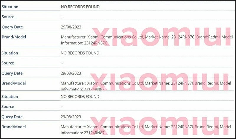 Redmi 13C sẽ có tên mã Air và có số model nội bộ là C3V. Bên cạnh đó, cơ sở dữ liệu IMEI đã tiết lộ số model của Redmi 13C ở các thị trường khác nhau bao gồm: 23124RN87C, 23124RN87G và 23124RN87I. Trong đó C, G và I trong số kiểu máy đại diện cho các đơn vị Trung Quốc, toàn cầu và Ấn Độ