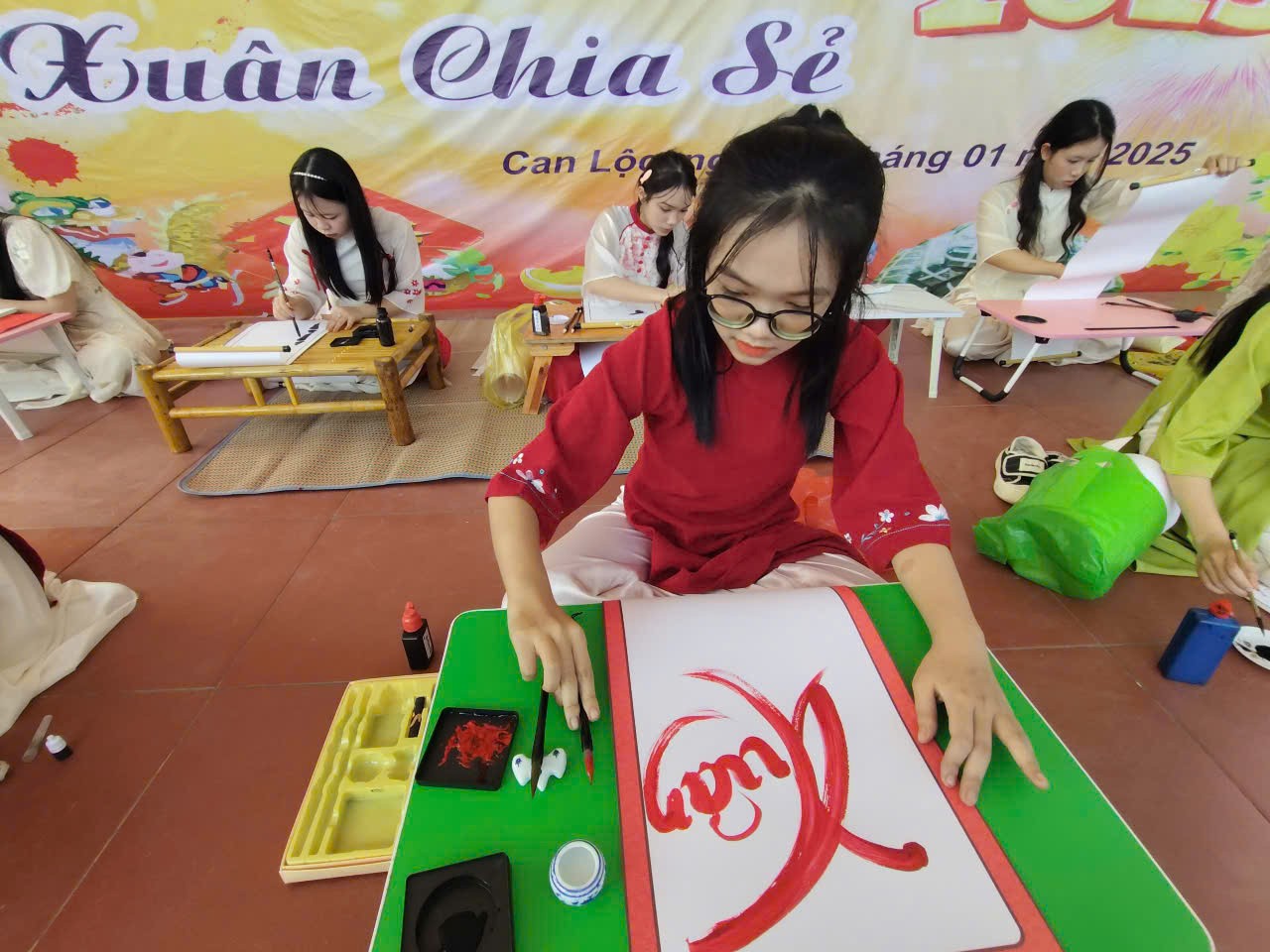 | Các em học sinh nhà trường viết thư pháp |