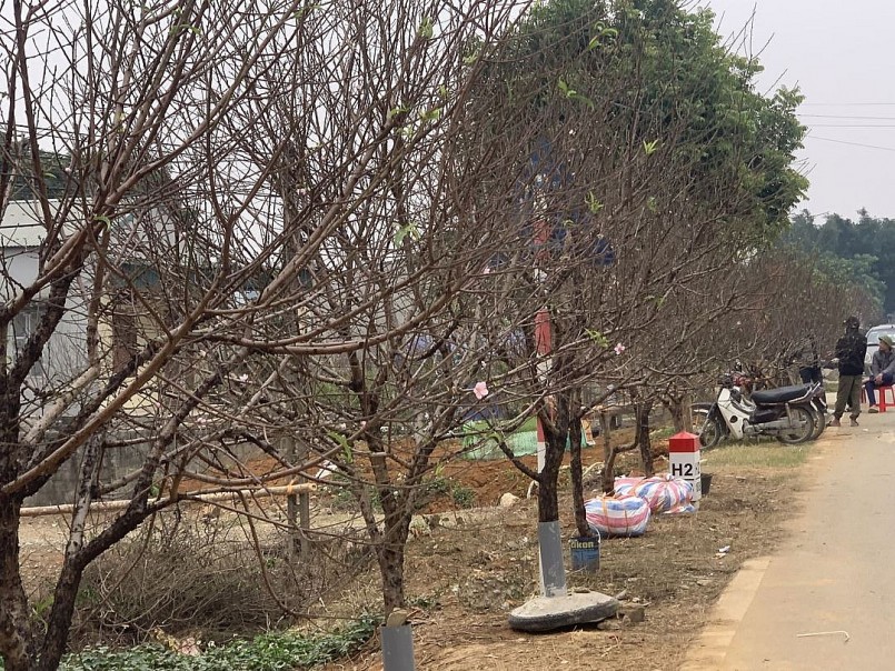 Tại vườn đào của gia đình ông Phạm Văn Thủy ở thôn 6, nhiều cây đào đã được khách hàng đặt mua và đánh dấu, chờ ngày chuyển đi. Đa phần các cây đào nhà ông Thủy có thời gian trồng từ 2 đến 3 năm, đều là những cây đào đến thời điểm cho thu hoạch. Năm nay, gia đình tôi có diện tích 5.400m2 trồng trên 3.000 cây đào, trong đó có gần 2.000 gốc đào từ 3-5 năm đang được thực hiện các bước chăm sóc cuối cùng để chuẩn bị cho ngày xuất bán.