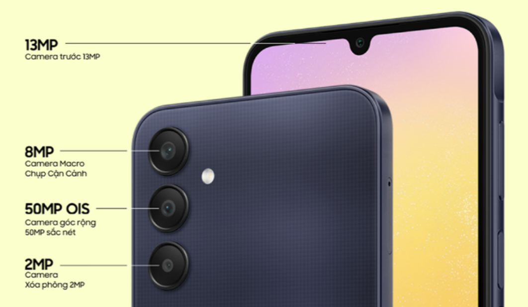 Samsung Galaxy A25 5G hỗ trợ WI-Fi băng tần kép, 5G, USB-C, cổng tai nghe 3.5 mm, GPS, Bluetooth 5.3, vân tay ở phím nguồn, bảo mật khuôn mặt.