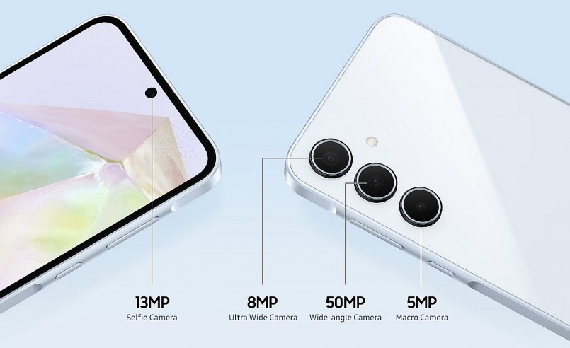 Mặt lưng vẫn giữ thiết kế của dòng A gần đây, hệ thống 3 camera gồm cảm biến chính 50MP hỗ trợ OIS, hỗ trợ quay video 4K@30fps. Máy ảnh siêu rộng 8MP và camera macro 5MP.