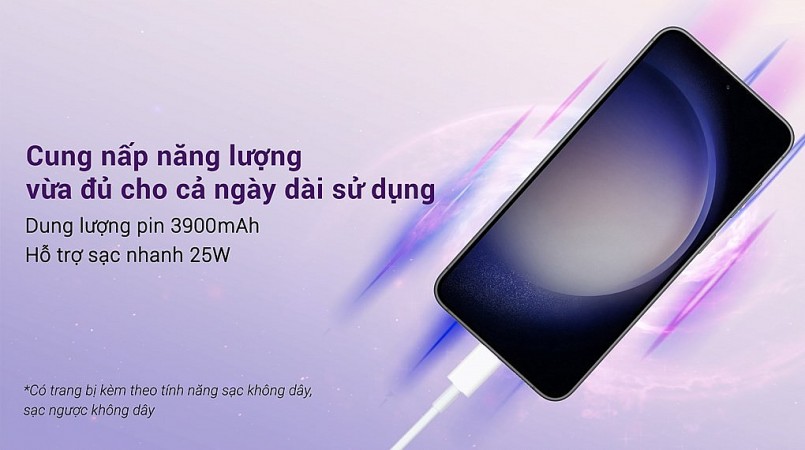 Samsung Galaxy S23 được tăng cường pin so với thế hệ tiền nhiệm, giúp người dùng sử dụng thoải mái hơn. Bạn sẽ thỏa sức luyện phim, chơi game, lướt mạng xã hội hay luôn giữ liên lạc, kết nối trực tuyến với mọi người, mà không sợ bị gián đoạn. Ngoài ra, để giúp cuộc sống tiện lợi, Samsung S23 có hỗ trợ sạc nhanh 25W, nạp đầy lượng pin nhanh chóng, sẵn sàng cho mọi hoạt động.