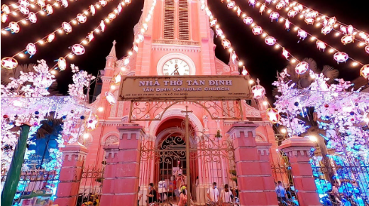 Nhà thờ Tân Định luôn là tâm điểm chú ý nhờ sắc hồng đặc trưng, nay lại càng thêm lung linh với những dải đèn trắng tinh khôi chạy dọc tháp chuông. Sự kết hợp giữa tông màu ngọt ngào và ánh sáng lấp lánh khiến nơi đây trông giống như một tòa lâu đài bước ra từ thế giới thần tiên, thu hút mọi ánh nhìn ngay từ xa.