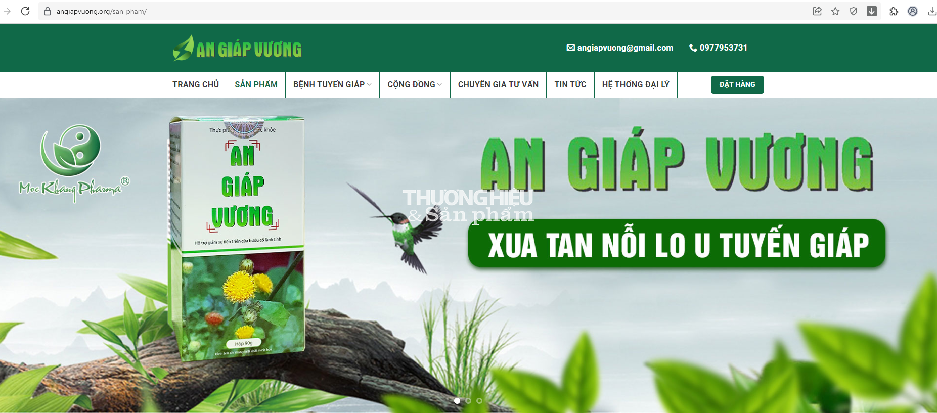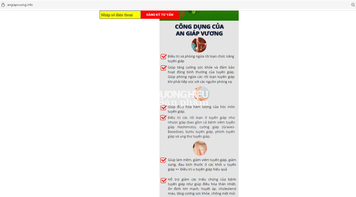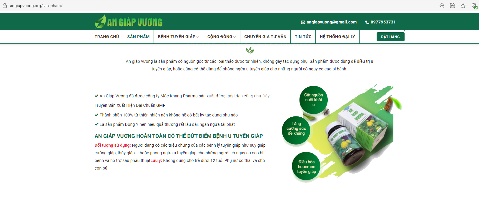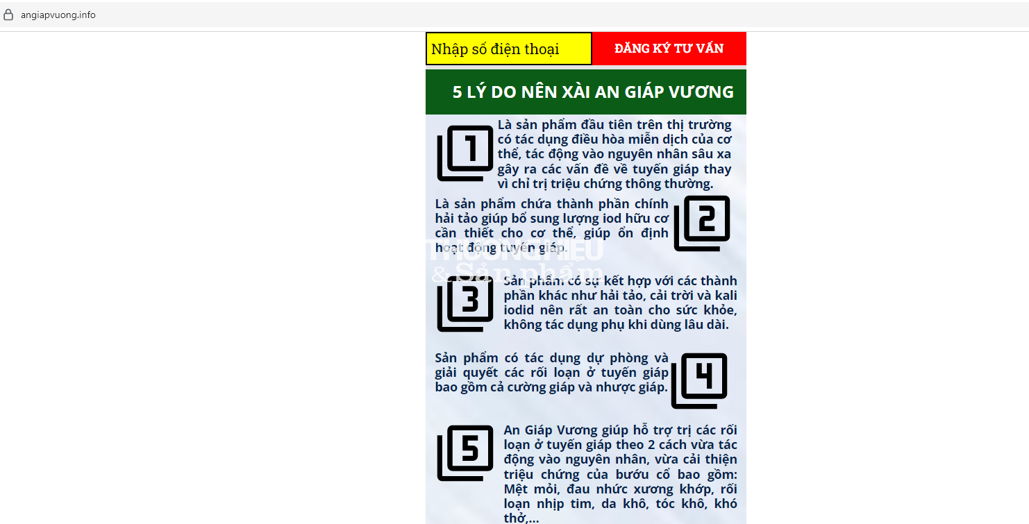 Còn tại website https://www.angiapvuong.info/ đang quảng cáo sản phẩm An giáp Vương với những công dụng như: Điều trị và phòng ngừa rối loạn chức năng tuyến giáp. Giúp tăng cường sức khỏe và đảm bảo hoạt động bình thường của tuyến giáp; Giúp phòng ngừa các rối loạn tuyến giáp khi phải tiếp xúc với các nguồn phóng xạ.