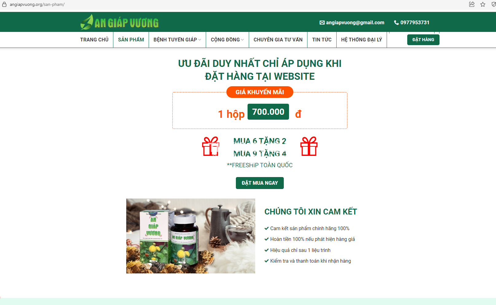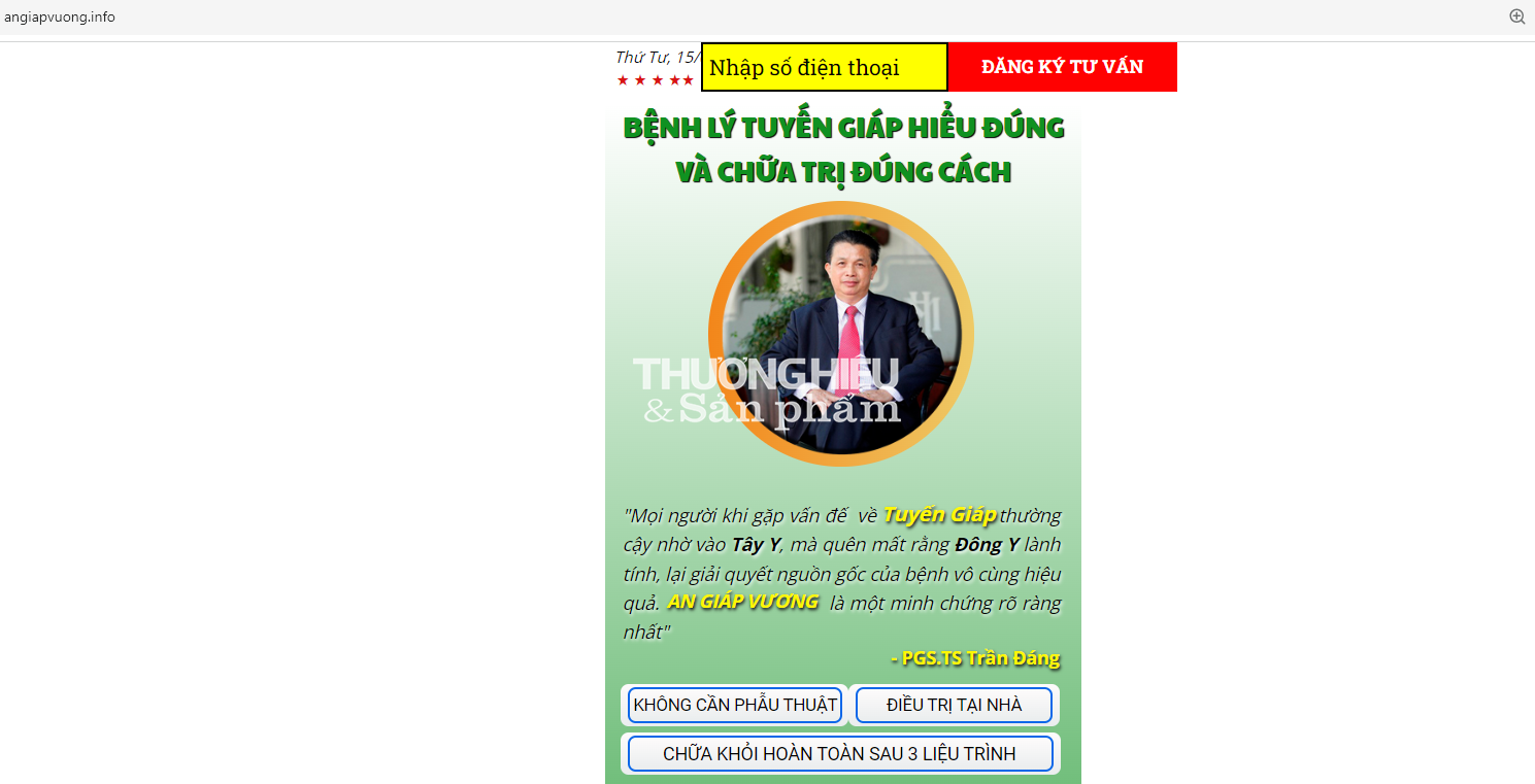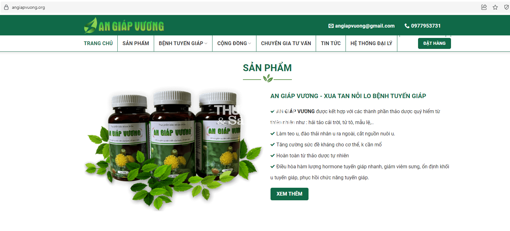 Còn tại website https://www.angiapvuong.info/ đang quảng cáo sản phẩm An giáp Vương với những công dụng như: Điều trị và phòng ngừa rối loạn chức năng tuyến giáp. Giúp tăng cường sức khỏe và đảm bảo hoạt động bình thường của tuyến giáp; Giúp phòng ngừa các rối loạn tuyến giáp khi phải tiếp xúc với các nguồn phóng xạ.