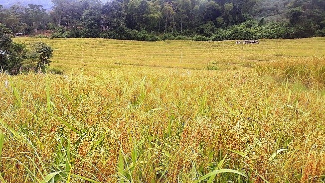 | Cánh đồng lúa nếp Cay Nọi ở xã Quang Chiểu vào mùa thu hoạch |