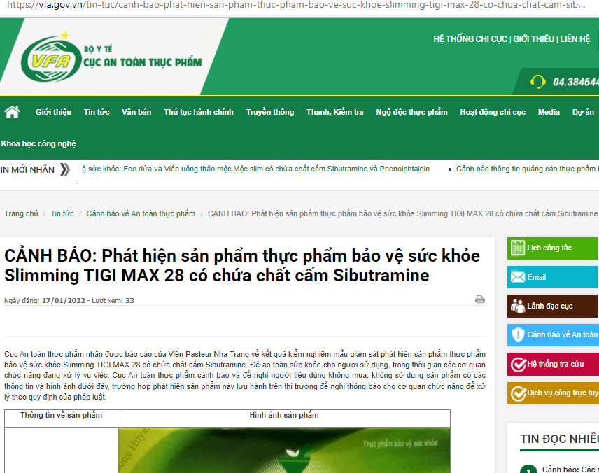 Cục An toàn thực phẩm (Bộ Y tế) vừa có cảnh báo về việc phát hiện chất cấm Sibutramine trong sản phẩm thực phẩm bảo vệ sức khỏe (TPBVSK) Slimming TIGI MAX 28.