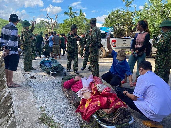 Tiếp tục thông tin về vụ sạt lở đất tại xã Trà Leng, huyện Nam Trà My, Quảng Nam, chiều 29/10, Ban Chỉ huy quân sự huyện Nam Trà My thông tin, lực lượng chức năng đã cứu sống được 33 người trong vụ sạt lở tại thôn 1 (xã Trà Leng, huyện Nam Trà My, tỉnh Quảng Nam), trong đó có 16 người bị thương. Những người dân bị thương được khiêng ra bên ngoài để được cấp cứu.