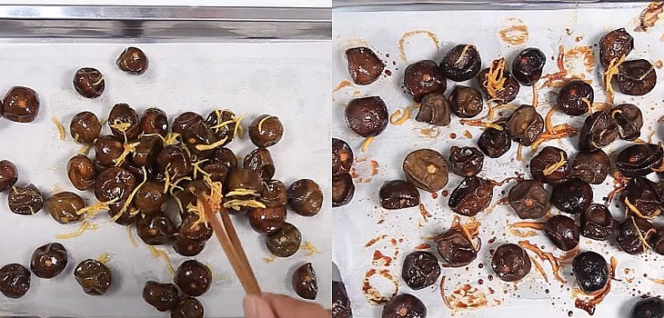 Cho sấu và gừng ra mâm nướng có lót một lớp giấy nến rồi cho vào lò sây trong 1 tiếng tại nhiệt độ 150 độ C.