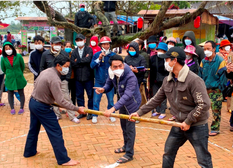 | Du khách trải nghiệm trò chơi đẩy gậy |