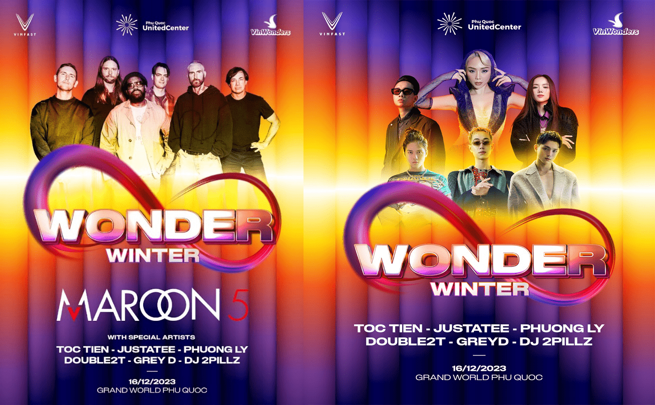Phú Quốc, Việt Nam, ngày 09/11/2023, 8Wonder Winter Festival do VinFast và VinWonders đồng tổ chức chính thức xác nhận Maroon 5 sẽ trình diễn một setlist trọn vẹn trong 75 phút trong đó bao gồm 11 bản hit toàn cầu, đồng thời công bố dàn sao Việt sẽ góp mặt tại siêu đại nhạc hội 8Wonder mùa đông gồm: Tóc Tiên, Justatee, Phương Ly, Double 2T, Grey D và DJ 2Pillz.