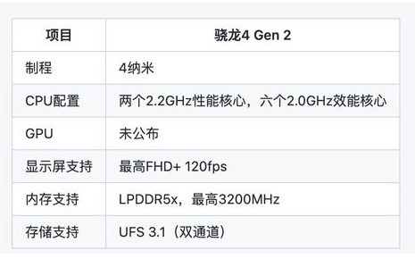 CPU mới có hai lõi hiệu năng (tốc độ 2,2 GHz) và sáu lõi hiệu suất (tốc độ 2,0 GHz). So với Snapdragon 4 Gen 1, điều này sẽ tăng hiệu suất lên 10%. Vẫn chưa có thông tin chi tiết về GPU Adreno và hỗ trợ hiển thị giống như phiên bản trước, lên tới FHD+ 120fps.