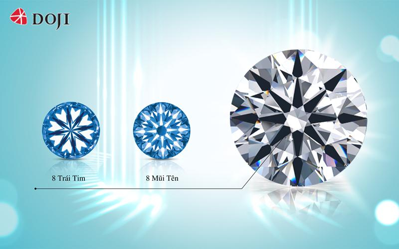 Cận cảnh viên kim cương siêu lý tưởng của DOJI với hiệu ứng 8 mũi tên và 8 trái tim.