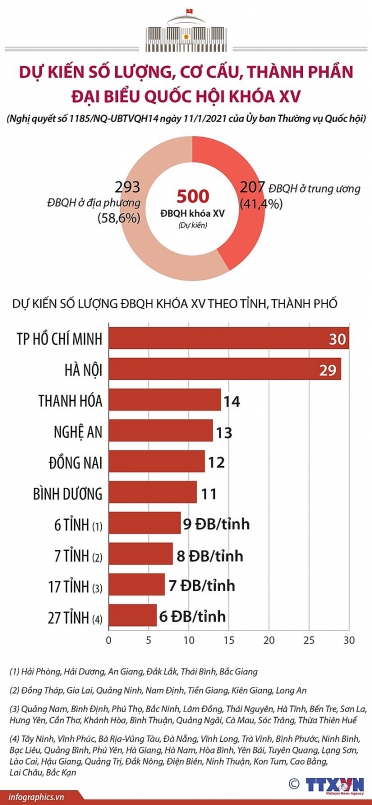Theo Nghị quyết số 1185/NQ-UBTVQH14 của Ủy ban Thường vụ Quốc hội ngày 11/1/2021, dự kiến tổng số đại biểu Quốc hội khóa XV là 500 đại biểu. TP. Hồ Chí Minh là địa phương có số lượng ĐBQH nhiều nhất, dự kiến có 30 đại biểu. Tiếp theo là Hà Nội, với 29 đại biểu.