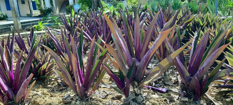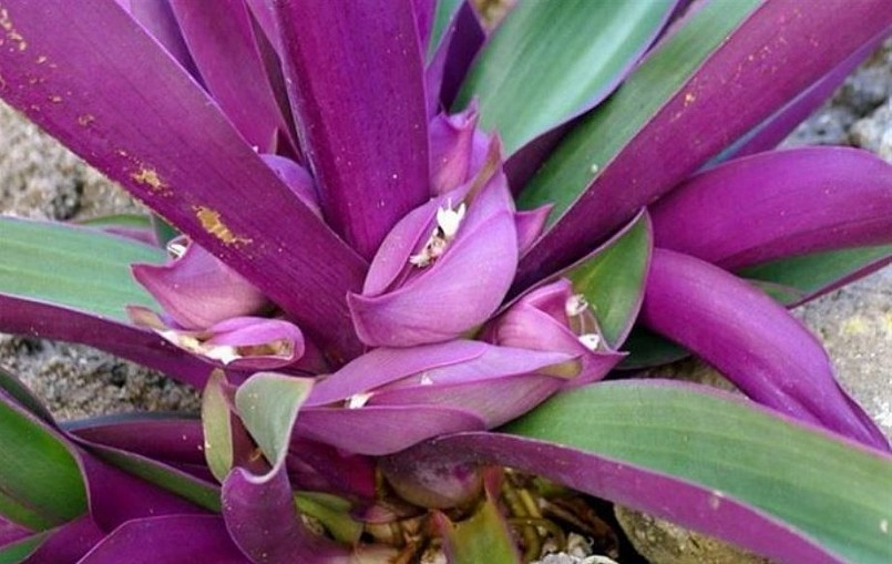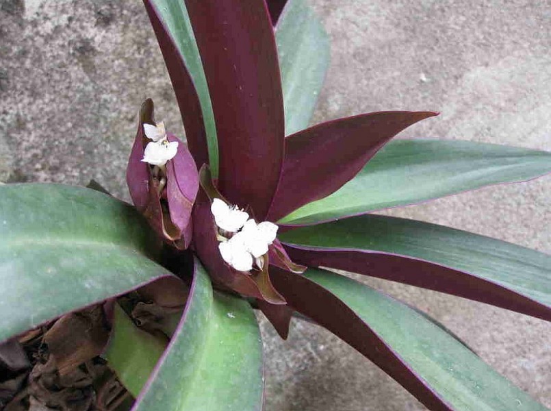 Lá màu tím ở phía trên và màu xanh lục ở phía dưới lá, có bẹ rộng ôm lấy thân, đầu lá tù hoặc nhọn, dài từ 15 - 30cm, rộng 3 - 5cm.