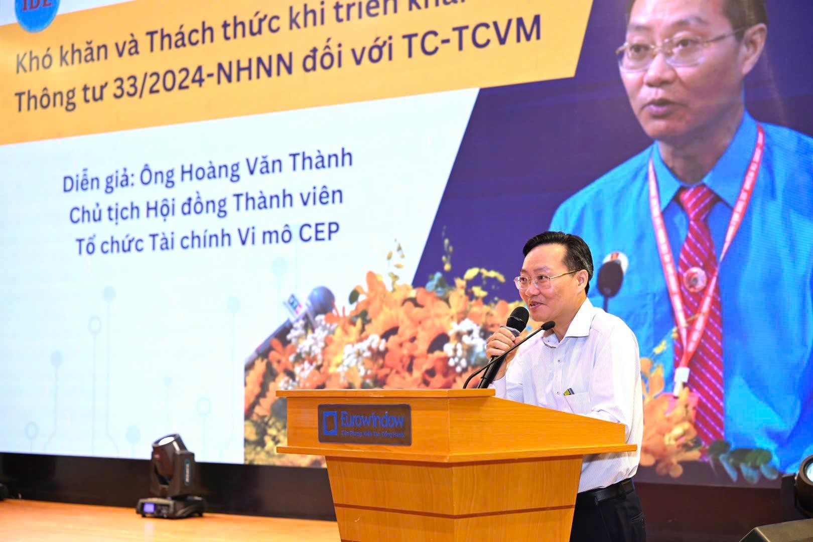 Ông Hoàng Văn Thành, Bí Thư Đảng ủy Bộ phận Tổ chức TCVM CEP, Chủ tịch Hội đồng thành viên tổ chức TCVM CEP trình bày tham luận về khó khăn và Thách thức khi triển khai Thông tư 33/2024-NHNN đối với TC-TCVM.