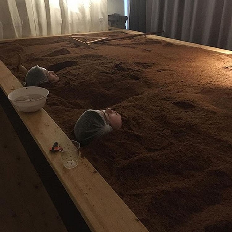 Đầu tiên, nhân viên sẽ đào một đường rãnh bằng phẳng, định hình như một chiếc giường ngủ, bạn mặc một bộ đồ mỏng hoặc khăn tắm rồi nằm xuống. Lúc này, nhân viên sẽ xúc cám gạo đổ lên người (giống như chôn), chỉ chừa lại mỗi khuôn mặt.