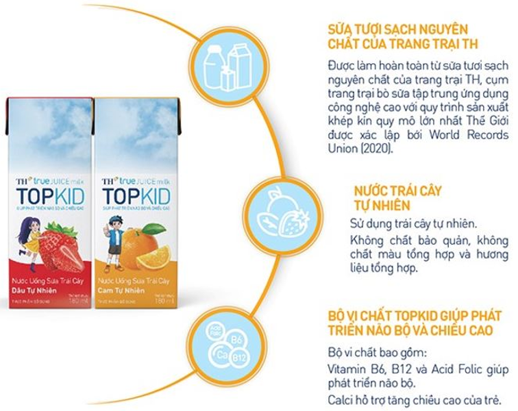 Theo thông tin từ nhà sản xuất – Tập đoàn TH, TH true JUICE milk TOPKID được làm từ sữa tươi sạch nguyên chất của trang trại TH và nước ép trái cây tự nhiên, cung cấp cho trẻ nguồn năng lượng hoàn toàn từ thiên nhiên. Sản phẩm thơm ngon, đã khát với hương vị thơm ngậy đặc trưng của sữa tươi TH, kết hợp vị chua chua ngọt ngọt của nước ép cam/dâu được trẻ nhỏ yêu thích.