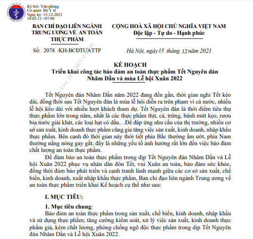 | Kế hoạch triển khai công tác đảm bảo an toàn thực phẩm Tết Nguyên đán Nhâm Dần và Lễ hội xuân 2022 |