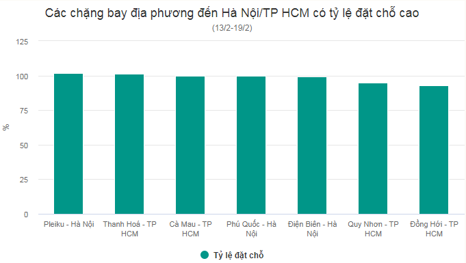 Tính đến ngày 12/1, các hãng hàng không Việt Nam đã bán từ 80% đến hơn 100% số chỗ trên các chuyến bay giữa TP HCM, Hà Nội với các tỉnh, thành phố khác trong dịp cao điểm Tết, từ ngày 24/1 đến ngày 25/2 (tức từ 14 tháng chạp đến 16 tháng giêng).