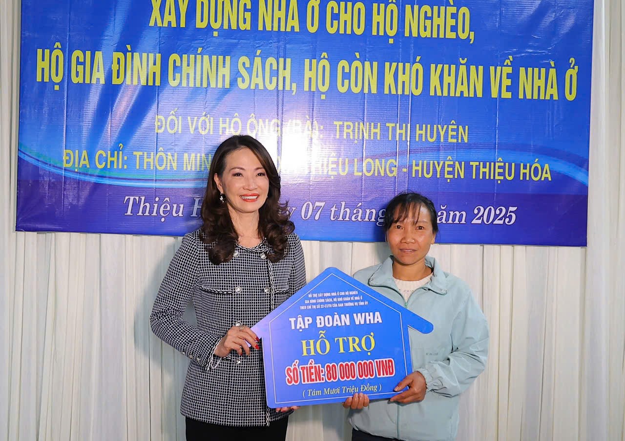 | Bà Jareeporn Jarukornsakul trao tiền hỗ trợ cho gia đình bà Trịnh Thị Huyên tại thôn Minh Đức, xã Thiệu Long. |