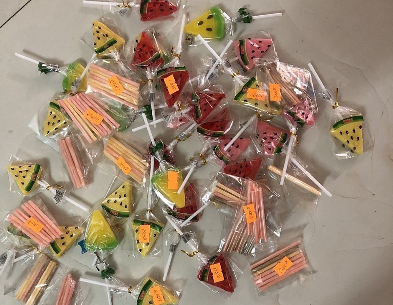 Tại thời điểm kiểm tra, Đoàn kiểm tra phát hiện các cơ sở kinh doanh này đang bày bán 311 sản phẩm là thực phẩm gồm chân gà gói, kẹo mút, kẹo que và kẹo dẻo được bảo quản trong các hộp nhựa, khay giỏ hoặc đựng trong các túi bóng, đều không có tên thương nhân chịu trách nhiệm về hàng hóa, không ghi nguồn gốc, xuất xứ hàng hóa.