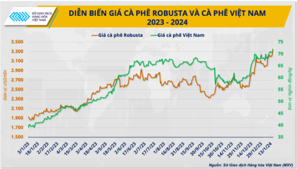 Xu hướng giá tăng cũng được thể hiện trên sàn giao dịch London. Cụ thể, giá cà phê Robusta kỳ hạn giao tháng 1/2024, tháng 3/2024, tháng 5/2024 và tháng 7/2024 tăng lần lượt 21,9%, 15%, 13,6% và 12,8% (so với ngày 30/11/2023), lên mức 3.075 USD/tấn, 2.837 USD/tấn, 2.766 USD /tấn và 2.704 USD/tấn.