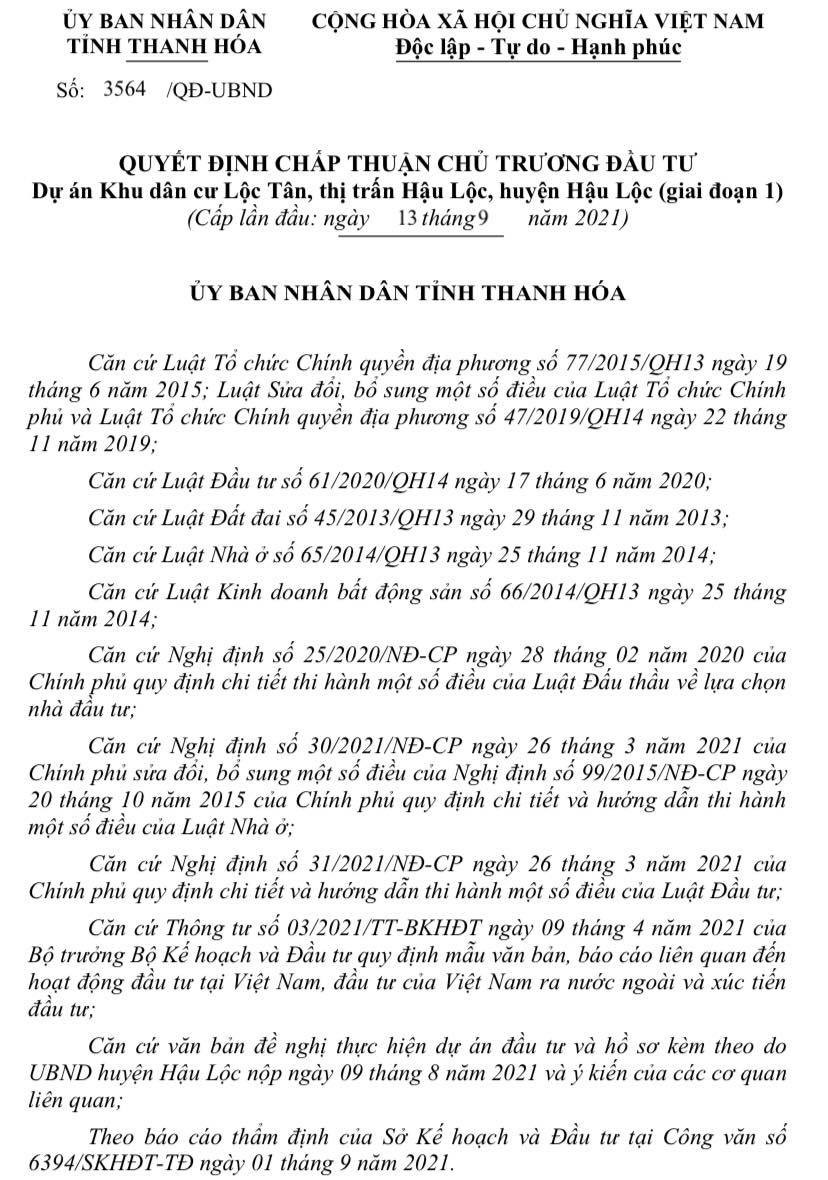 UBND tỉnh Thanh Hóa vừa có Quyết định số 3564/QĐ-UBND về việc chấp thuận chủ trương đầu tư dự án Khu dân cư Lộc Tân, thị trấn Hậu Lộc, huyện Hậu Lộc (giai đoạn I).