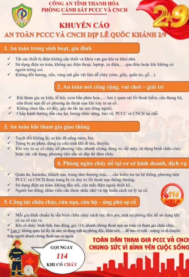 Kỳ nghỉ lễ Quốc khánh 2/9 năm nay kéo dài 4 ngày, là thời điểm các hoạt động văn hóa, thể thao, du lịch, vui chơi giải trí, mua sắm… diễn ra sôi động trên khắp cả nước. Đây cũng là dịp người dân trở về sum họp gia đình, cùng nhau tận hưởng kỳ nghỉ. Tuy nhiên, lượng người và phương tiện tập trung đông tại các khu vực công cộng lại tiềm ẩn nhiều nguy cơ cháy nổ, sự cố, tai nạn, đặt ra yêu cầu cấp thiết đối với công tác bảo đảm an toàn phòng cháy, chữa cháy và cứu nạn, cứu hộ (PCCC và CNCH).