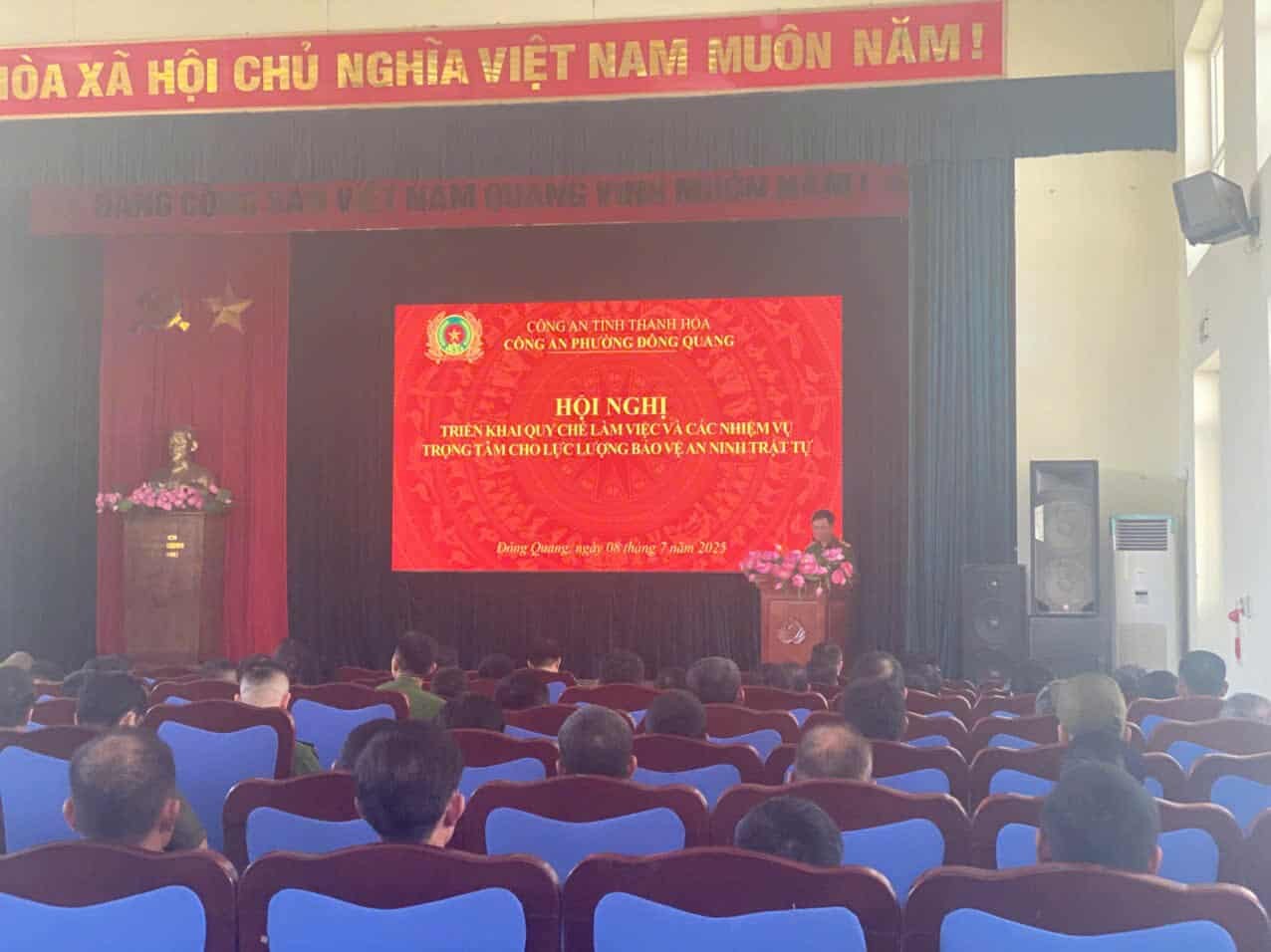 Ngày 8/7/2025, Công an phường Đông Quang, tỉnh Thanh Hóa tổ chức Hội nghị triển khai quy chế làm việc và các nhiệm vụ trọng tâm đối với lực lượng bảo vệ an ninh trật tự (ANTT) tại cơ sở. Đây là hoạt động có ý nghĩa quan trọng nhằm chính thức kích hoạt cơ chế vận hành mới, tăng cường hiệu lực – hiệu quả của lực lượng bảo vệ ANTT sau sắp xếp đơn vị hành chính.