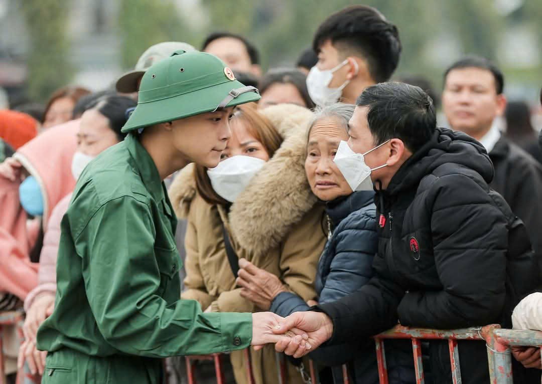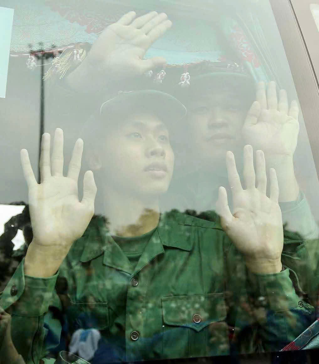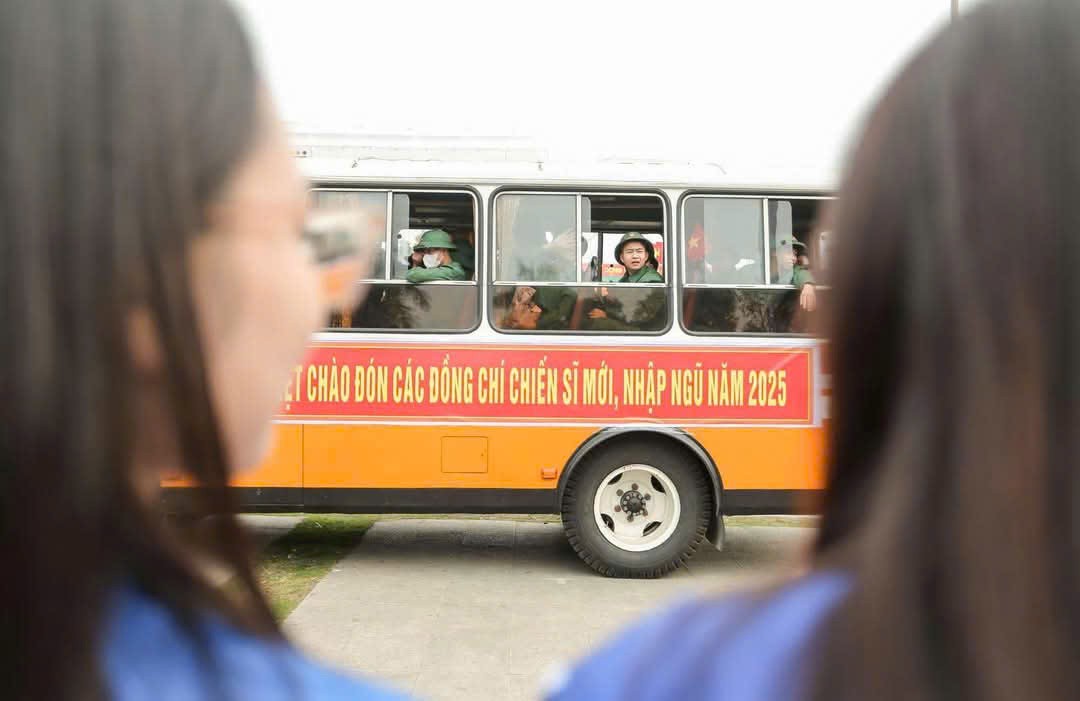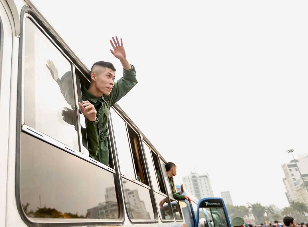 | Chiến sĩ tân binh vẫy chào gia đình trước khi về đơn vị mới |