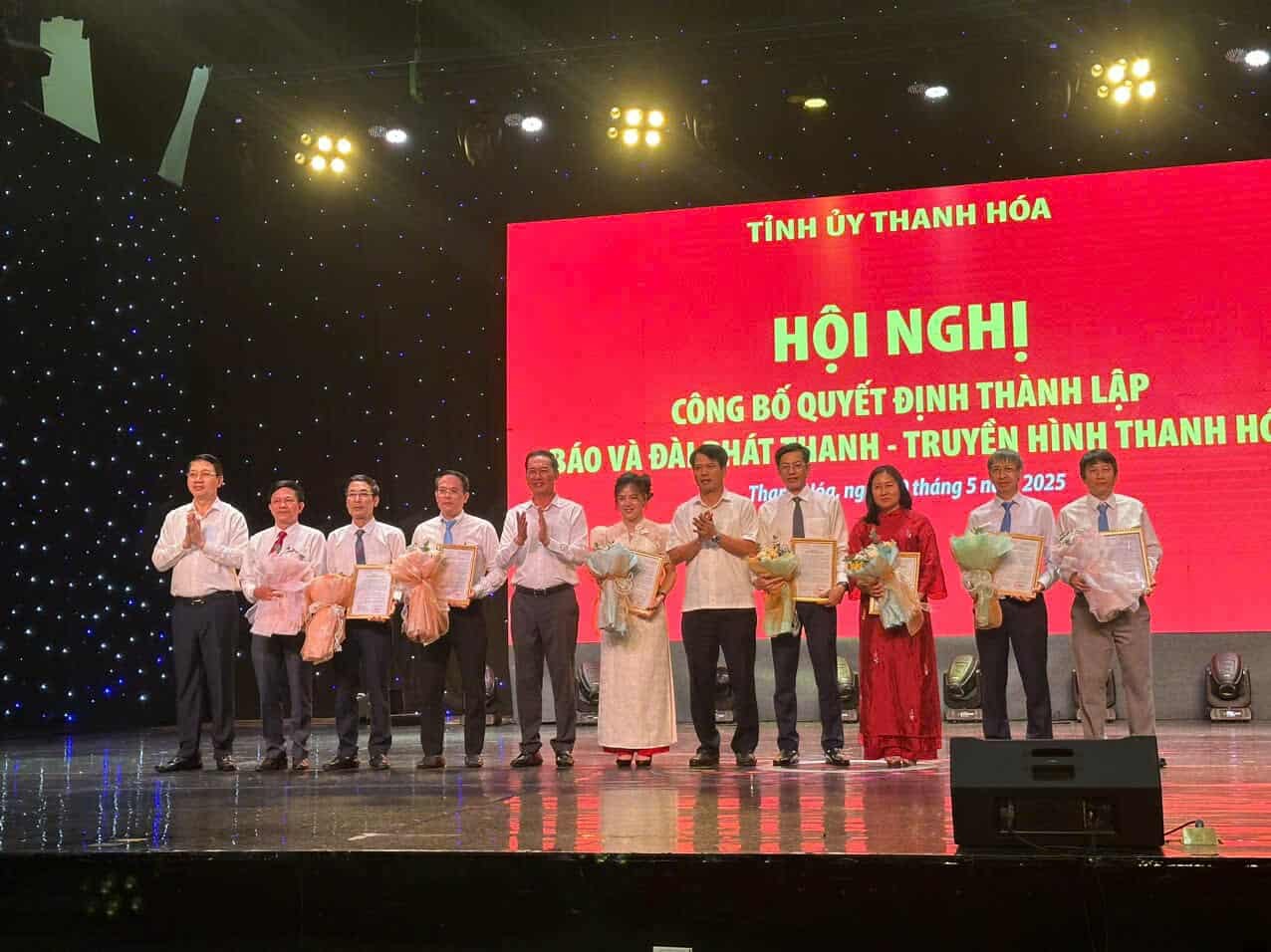 | Lãnh đạo tỉnh trao quyết định thành lập Báo và Đài Phát thanh - Truyền hình Thanh Hóa; trao quyết định bổ nhiệm Tổng Biên tập, các Phó Tổng biên tập và tặng hoa chúc mừng các đồng chí được bổ nhiệm |