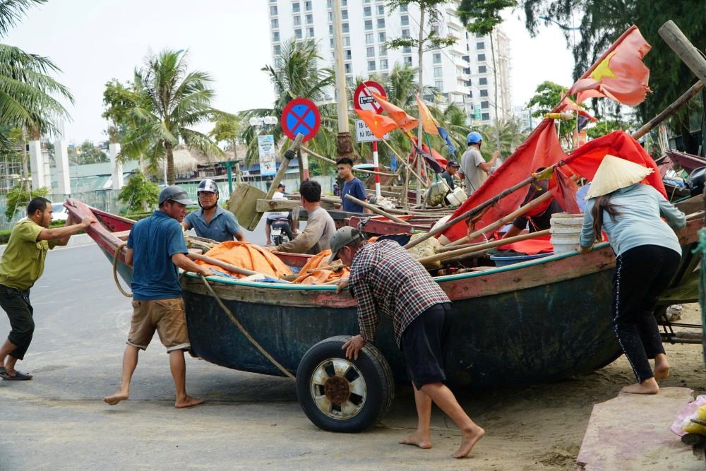 | Ngư dân khẩn trương đưa tàu thuyền lên bờ tránh trú bão số 5. |