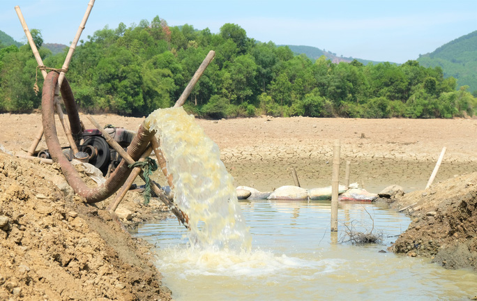 Xã Mậu Lâm (huyện Như Thanh) phải dùng máy bơm để hút nước dưới đáy của hồ