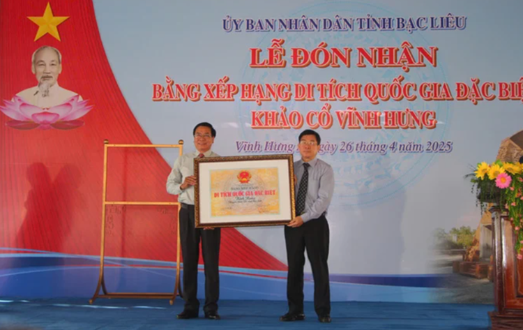 | Ông Nông Quốc Thành, Phó cục trưởng Cục Di sản Văn hóa, Bộ Văn hóa Thể thao và Du lịch (bìa phải) trao bằng xếp hạng Di tích Quốc gia đặc biệt Di tích khảo cổ Vĩnh Hưng cho đại diện Sở Văn hóa Thể thao và Du lịch tỉnh Bạc Liêu. |