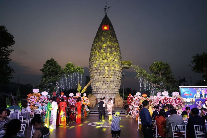 | Tháp Thần Nông được ghép bởi 1.012 chiếc cối đá xếp vòng ngoài, bên trong là khung cột bê tông được đổ kiên cố. |