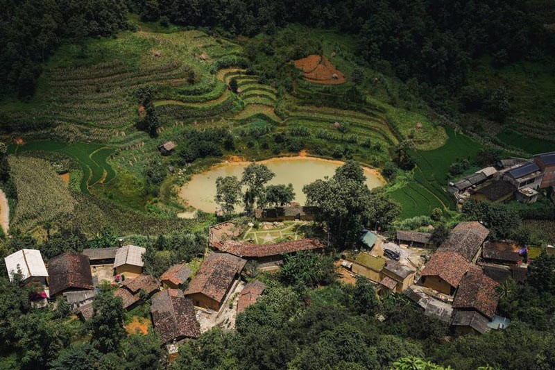 Tên gọi Thèn Pả trong tiếng địa phương nghĩa là “cánh đồng lớn” – một vùng đất bằng phẳng hiếm hoi giữa cao nguyên đá. Từ trên cao nhìn xuống, làng tựa dải lụa vàng mềm mại vắt ngang triền núi, những mái nhà trình tường đất vàng cổ kính nằm xen giữa ruộng bậc thang xanh ngát. Mỗi buổi sớm, làn khói bếp lững lờ bay giữa sương, mây giăng phủ kín bản, vẽ nên bức tranh thủy mặc vừa hư vừa thực.