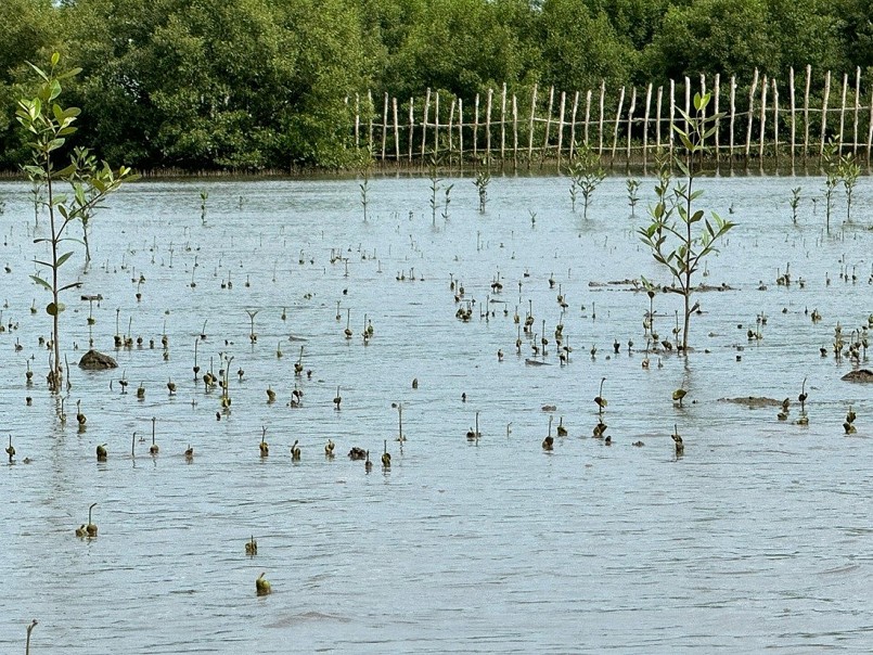 Chưa đầy 9 tháng kể từ ngày dựng hàng rào khoanh nuôi, cánh rừng đã đón hơn 71.000 “cư dân” đầu tiên. Đó là những cây mắm đen nảy mầm từ hạt của những cây mắm “mẹ” rụng hồi tháng 8 năm ngoái. Với hệ rễ phổi độc đáo – mọc ngược từ dưới lên, cây mắm được ví như những “người lính” quả cảm, giúp cố định đất bùn tạo điều kiện cho các loài cây khác như đước, sú, vẹt… lấn về phía biển. Mỗi năm, vùng đất bãi bồi có thể lấn ra biển gần100m.