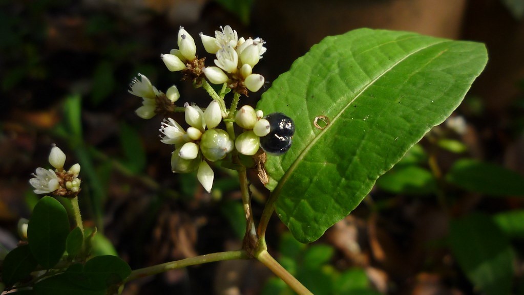 Lá thồm lồm mọc so le, hình bầu dục hoặc hơi thuôn, dài 3 – 7 cm, rộng 3 – 5 cm. Mặt lá xanh thẫm, gân lá nổi rõ. Hoa mọc thành cụm xim ở đầu cành, màu trắng sữa, nhỏ, tạo nên vẻ mềm mại đặc trưng cho loài cây dân dã này.