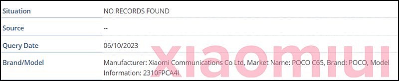 Các ảnh chụp màn hình được chia sẻ bởi Xiaomiui cho thấy POCO C65 đã xuất hiện trong cơ sở dữ liệu IMEI với số kiểu máy là 2310FPCA4G và 2310FPCA4I, ứng với hai phiên bản là quốc tế và Ấn Độ.